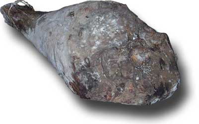 More significantly, last night I brushed the fuzz off the pig leg I dry-salted in November 2005 (at my Pork Processing workshop), finished salting it through that winter, then hung it in our masonry heater through last summer to ferment. When we fired up the heater for this winter, we moved the nicely fuzzy pig leg into our front room that stays around refrigerator temp through the winter to slow-down the summer fermentation and let it dry out a little more. All of this according to Paul Bertolli’s amazing and a food geek’s dream cookbook “Cooking By Hand.” The salted pig leg was almost forgotten, but yesterday Alison asked if it was time to taste the pig leg. I said, why not?
