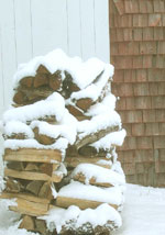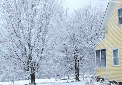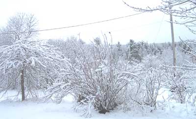 This morning we woke up to this perfect winter scene of about three inches of fluffy but wet and scrunchy snow on top of everything making this perfect little scene around our house. The deciduous trees looked like the hand-knotted lace curtains hung in every window on the island of Ouessant — each one an original design. The conifers seemed more like 3-D Rorschach tests with deep dark splotches woven through bright white spaces. But by 10:00am the sun started to come out, the temp edged just over freezing, and all the beautifully balanced snow started dropping off. By 11:00am the trees were bare of snow, and I expect the mix of crusty banks and mud to be visible again by the end of the day. Knowing that this was such a temporal scene, I snapped a few pictures to share: the top scene looks south toward the moraine hills the lead to the mouth of the Passagassawakeag River and Penobscot Bay. Other pictures show our rose hill and weeping crab apple in front of our woodlot; also, a few of the red maples that line our driveway.