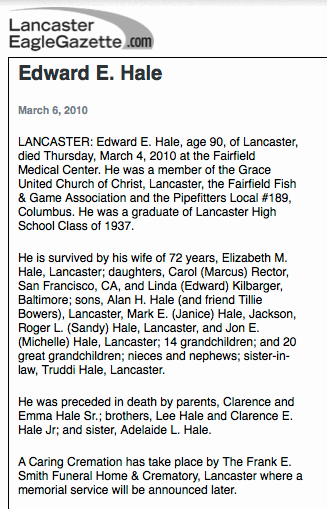 1. Marc, A very nice tribute. My sympathies to Carol and you and the whole Hale clan. Wow- 15 grandkids plus 20 great grandchildren- what a legacy! Alison