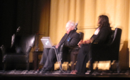 MY TAKE: This was the best evening, without question, as great as Walter Sellas and Robert Duvall were. Roger Ebert had to have his larynax removed, so he cannot speak – he speaks through a voice synthesizer by typing into an Apple laptop. His “friends” paid him tribute by telling stories of their friendship and illustrating what a force he has been in the film industry – going far beyond brilliant writing and reviewing. Philip Kaufman noted that when he made Henry and June, the Motion Picture ratings board rated it “X,” death to distribution. Ebert went to bat for him with the board, causing them to create “NC17.” Ebert listened intently and made animated oversize gestures to illustrate his reaction, carrying on the “conversation.” He made – through his laptop, concluding remarks including the most appropriate Truffaut quote above. It’s amazing how his voice comes through the computer with enthusiasm and expression. And it is his voice, modeled from a videotape of an interview with Philip Kaufman. One of the “friends” noted that he may not be able to speak, but “he twitters more than a roomful of teenage girls.” What a night!.