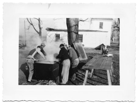 Uncle Sonny sat on the grindstone, pedaling while he held the knife against it, throwing sparks. Charlie was just back from the Army, and he stood over a table in a green tee shirt and suspenders wiping a blade back and forth on a steel he held like a sword. Behind him was the great big kettle belching smoke and steam and a tri-pod of big poles straddling it.