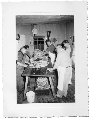 We went back to the group that was finishing up the second half. Mr. McKenna had a big white apron on that was now pink in spots. He was the only one who talked while they worked, telling jokes most of the time, but telling them what to do next.