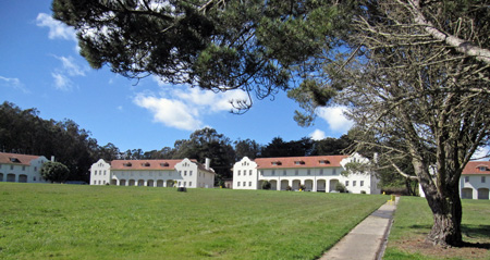 We started at the SNAG TOWER (11) by Fritz Haeg. Based on the idea of a “snag tree,” a dead tree left standing in the forest to provide habitat for forest critters in its trunk, roots, limbs, surrounding plants and so on. In this case, think of birds on the perch, or entering through the slats, snakes living in the concrete chunks, and so on. Fort Winfield Scott, where Presidio Habitats resides, is a post within a post. Soldiers got tired of traipsing up the hill from the Crissy Field barracks to defend the northwestern batteries of the Presidio when there was an alert. Thus, Fort Scott was built and manned by its own General and troops.