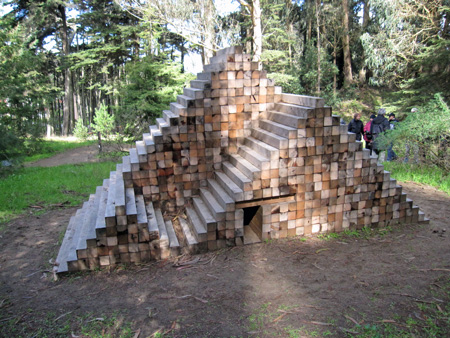 Through a “coyote fence” and around a road, we finally walk on a trail. The trail system at the Presidio has undergone extensive design and construction in the past two years. The trails are now clear, well signed and handicapped accessible. And I must say they are beautiful and inviting. I’ve been meaning to do some trails, but didn’t know where to begin. Now I know. Here, at a crook in the trail, stands SCULPTURE HABITAT FOR THE GRAY FOX (6) by CEBRA. The triangular sculpture is built of interlocking wood members — I’ll call them 4x4s — forming a central cavity or fox den. They’re salvaged from the cypress trees removed in the Presidio reforestation program and milled on the site. It is a stunning structure to suddenly come upon during your walk.
