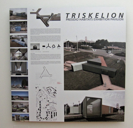 She started by explaining the Presidio Habitats Exhibition Hall, a triskelion, three shipping containers put together to form an interlocking triangle. All materials used in the construction of the triskelion are re-purposed and from the Presidio itself, although the three shipping containers are not from the Presidio, they are not new. In fact, all of the installations use re-purposed materials from the Presidio.