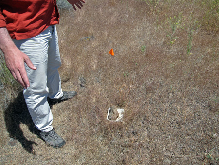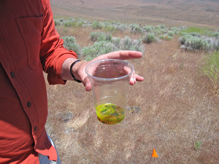 Brian has “6 sites in NE California & NW Nevada, with 6 transects/site (3 transects in thick medusahead and 3 not; each transect has 6 cups, of which 3 are open at any given time.” He showed me one non-medusahead transect.