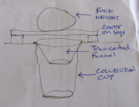 Collection cup with bugs. The liquid is dilute antifreeze which preserves the bugs and doesn’t evaporate. Cups are collected at each site every three weeks. Bugs are taken to the lab and identified.