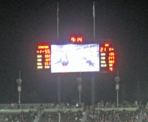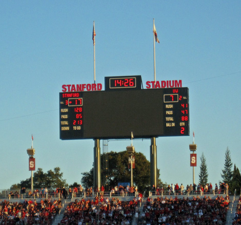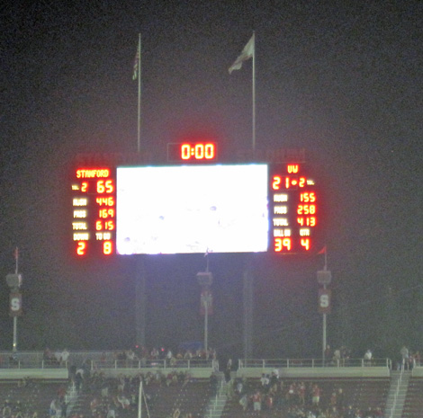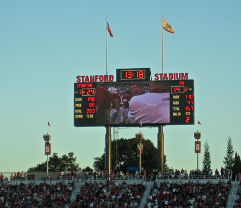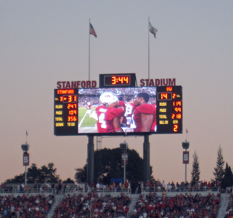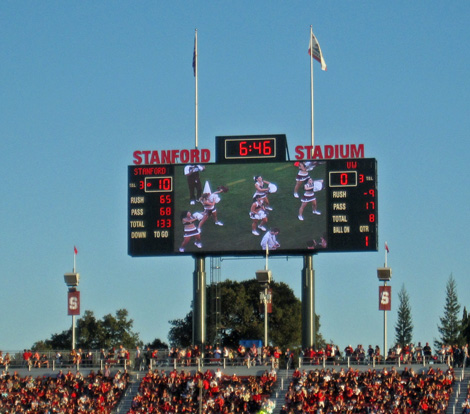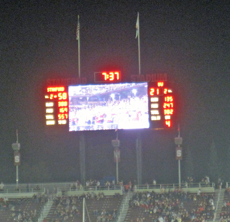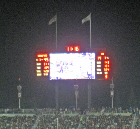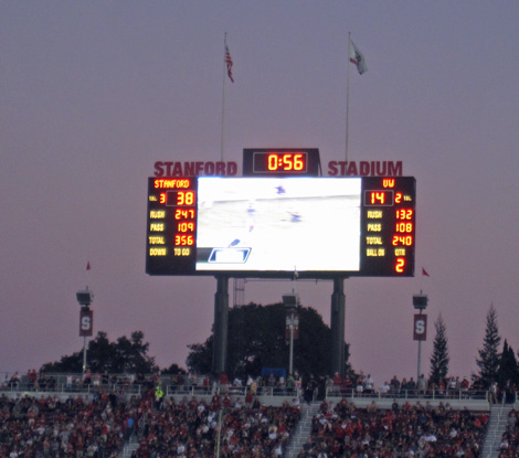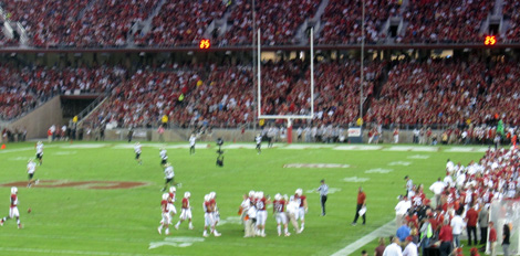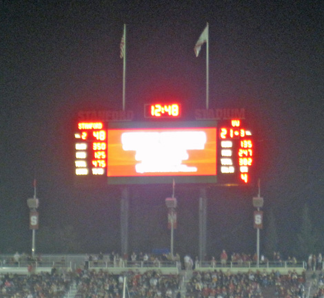 2009 versus Oregon with Sarah, a normal and sunny afternoon game. I got tickets from the Stanford website and knowing nothing about the stadium, settled for upper deck, Row XX, above the student section. I discovered that in this 50,000 seat, newly remodeled stadium, there are no bad seats. Stanford won in a wild game 51-42, but it was not without thrills, as the Ducks mounted a 21 point comeback in the 4th quarter and were driving as the clock expired.