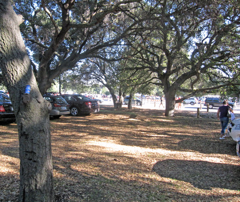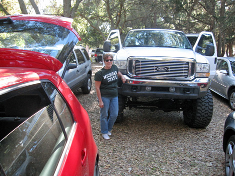 Knowing the ropes a little bit, Carol, Sarah and I planned to get there early for our version of a tailgate. We’re not really tailgaters, having no portable grill, portable TV, camp chairs and what not, but Sarah made her famous “meat bombs” — French rolls, hollowed out, stuffed with a ground beef, gumbo mixture and baked in tightly wrapped aluminum foil packets. Turns out to be a perfect tailgate food. No muss, no fuss (‘cept for Sarah). Add a couple frosty cold Budweisers and call it a tailgate.