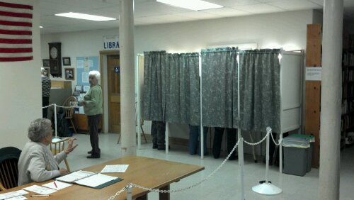 This is the entryway of the Monroe Town Hall that is converted to our polling place on election days. We use a pencil, tied to a string attached to the wall, to mark a paper ballot that we then deposit into the official (and probably 100+ year old ballot box (on the left, just above the clerk’s head) which has a sliding cover over the slot so it can’t be stuffed when no one is looking.