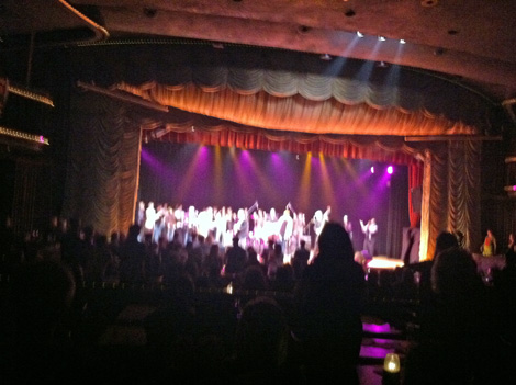 The Celebrity Room is a nice room, just the right size for such an event; much the same size and feeling as Yoshi’s in San Francisco. Tables and booths are arranged on tiers, with seats way too close together, but generous aisles for the food and drink ladies. We sat at a table for six that would have been really uncomfortable with six, but was just right for four. So the room was about 2/3rds capacity, just right.