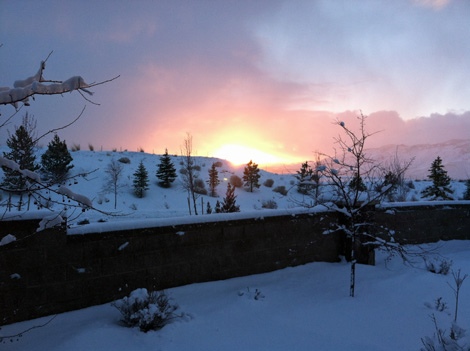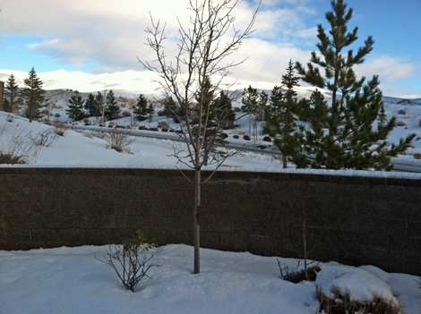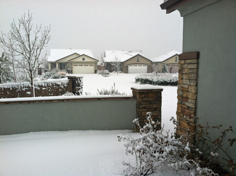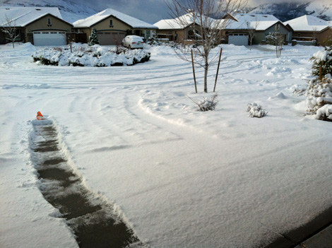 Now, we’re in Reno and experiencing our first mountain west winter. On Saturday, that meant snow — lots of windblown, very, very wet snow. So I bored y’all with pictures and so on. The weather changed to sun and a high blue sky on Christmas day. Brian and Natasza came over for a cheese foudue repast. In the late afternoon a big gray cloud appeared in the southwest. Weather guys had been saying that we were experiencing a 3 part storm wrapped around a LOW moving into California. Well, here comes part three. Tiny, flurry like flakes appeared just before dusk, around 5pm. Carol is fond of saying, “Little flakes, big snow; big flakes, little snow.” Yeah, right. The next morning we had four more inches, making 10 inches on the ground on our north back terrace.