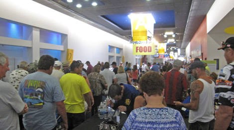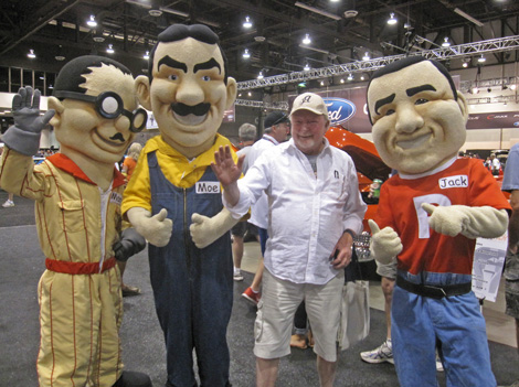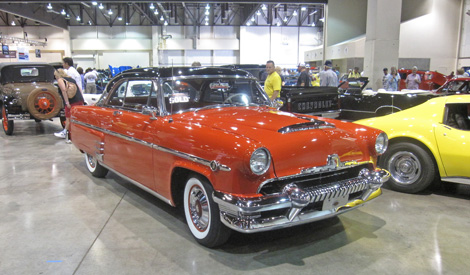 Quite a line to the bag check before entering the Showroom… but plenty of room inside.EVERYTHING is for sale.Ford and Chevy are two of the Hot August Night sponsors, so they get to show off their wares, as well.Speaking of Fords, here’s a sweet ’41 Convertible… maybe my favorite car on the floor.… or maybe this ’54 Mercury is my favorite… so many choices.Manny, Moe, me and Jack are ready to go into the auction.Place was packed. We found seats in the sixth row of the bleachers behind the floor where the registered buyers are located. This is a ’55 T-Bird that went for ONLY $32,500. Surprising, because the ’55 was the first T-Bird made.’55 Chevy Bel Air went for $40 grand.