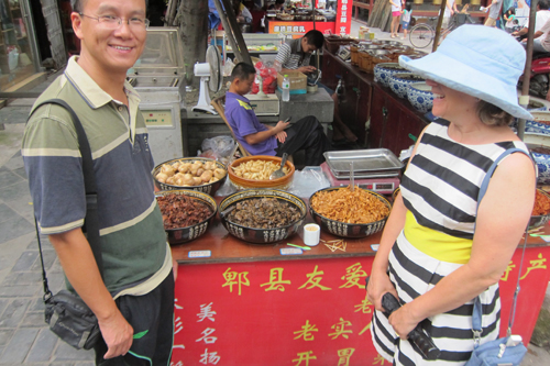 The next day got our bearings, caught up on correspondence, napped in the gray overcast afternoon. At 4pm we were picked up to explore culinary Chengdu with our Guide Tom. First a local sauce stand (10 different chile sauces!), then a wet market (mainly seafood, but good quality dry goods as well), and then the Ghost Food market, now sanctioned and stuffed with teenagers in the last few hours of their summer vacation. Here is what we managed to eat from the long list of available street food dishes: