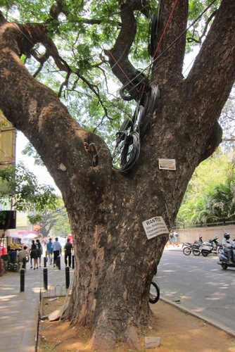 Occasionally in this area I’ve run into some amazing large and ancient trees that overarch the roads providing wonder areas of shade that all have at least one juice cart (if not several juice stands) vending under them. Even more amazing, as you get near them, is to realize that they provide not just shade but have also been integrated into the power and information grid, supporting all manner of wires running along the streets.