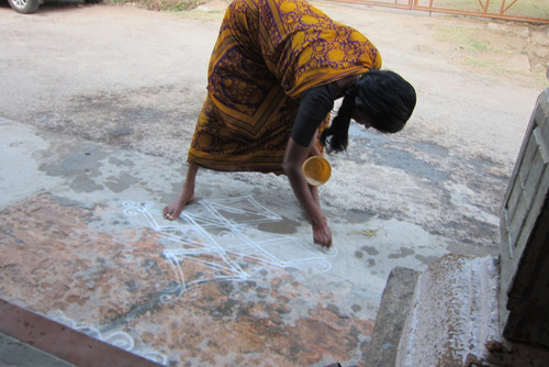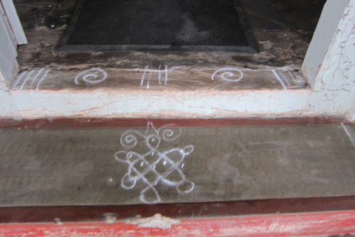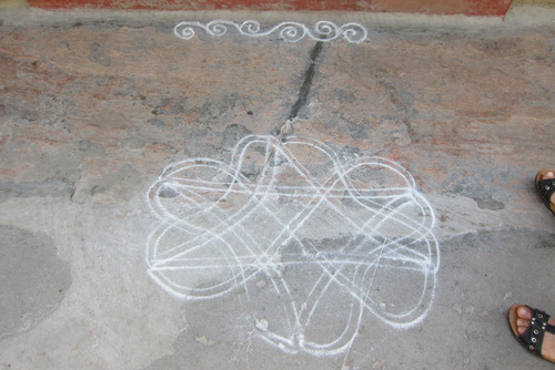 We were put up several blocks away in an empty house overlooking the Cheluvanarayana Swamy Temple, which gave us to chance to walk through the neighborhood on our way to and from the Trust during the three days we visited. Early in the morning that often meant meeting a troop of macaques (bonnet macaque, Macaca radiata) during their morning rounds of the town, as well as several dogs we began to recognize when we encountered them elsewhere. We also got to witness the daily creation of new kolam on the walkways in front of their home’s entrance. These were beautiful drawings made by hand using fine white powder laid onto the freshly washed, moist stone or concrete surface. Often the kolam changed each day, which made every morning’s walk even more of a discovery.