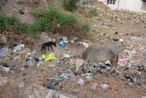 Famously the cows in India wander freely and are accepted as a part of the community. This seemed true in Melkote as well, though it also appeared that most cows were owned or attached to specific families, and they spent some time penned within a home’s outer walls, primarily for the morning and evening milkings. Late morning small herds of cows (and often other livestock like goats, sheep, and water buffalo) were shepherded through the streets, either on their way to a grazing site (which in some cases means a pile of fresh garbage) or having been collected from the grazing site being led back home.