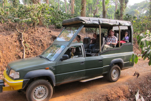 The same Naturalist from the night before was our guide, and he was just as informative and helpful as we drove narrow dirt tracks between the coffee bushes, down into gulleys, and then up onto ridges. We saw where they processed the coffee beans (between September and December depending on the variety), we saw workers harvesting green peppercorns (which would turn black after about a week of drying) using very long bamboo poles with cross-bars hammered through for climbing up. We saw coconut plantings, betel nut plantings, cardamom plants, wild honeycomb hanging high up in some of the shade trees, among them jackfruit trees heavy with fruit.