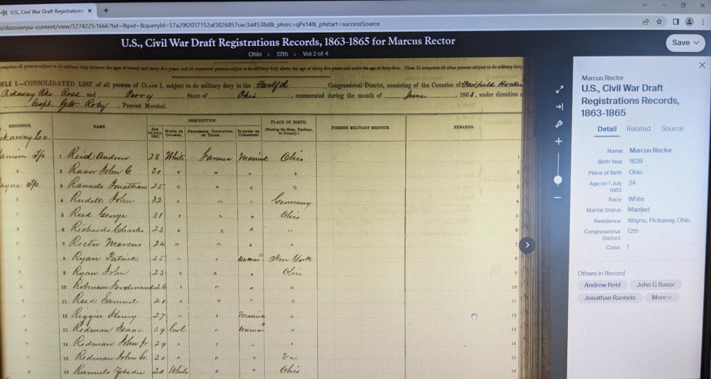 I can also now add that not only did Spenser Rector move our line to Ohio shortly after the Revolutionary War, but his grandson — Marcus Clay Rector — was drafted into the Union Army in 1863 to fight against…his family, in some cases!