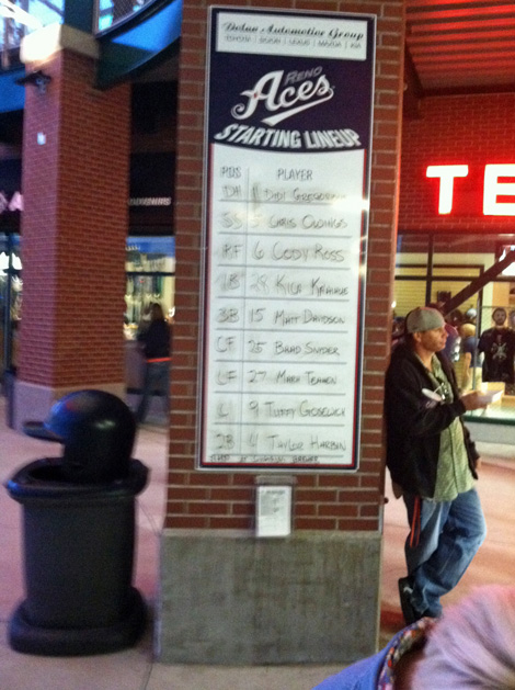 that, but Dollar Hot Dog Night and Dollar Ribs Night. Who could ask for more. Eric and Brian got seats in our section — and eventually in our row — and we settled back to enjoy the game. It was a pretty good game and ended up 7-2, aces winning before 4,080 lucky fans.