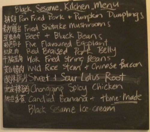 Having gotten that done so quickly, I decided to figure out where Black Sesame Kitchen was located — we had signed up for a dumpling class there on Saturday. It’s also in a hutong, not far from our Courtyard 7 Hotel hutong, except they were located in a small bit that had been built into the courtyard space by subsequent generations of residents over the centuries, so you entered a gate into is best described as a “warren” turning left, then right, then right, then right, then left every few steps until you enter a small open space in front of Black Sesame Kitchen. I was greeted by Coco, one of the workers who speaks English, and I confirmed that I would arrive for the dumpling class the following day. She asked: where will you eat tonight? I said that we would like to find a nice duck restaurant, and she told me where she likes to eat duck, but then she said: Would you like to eat here? She showed me the menu, written up on a small chalkboard on the wall, and it looked like a compilation of many many dishes that I’ve cooked, or wanted to cook, but would love to experience when done by a skilled chinese chef. She said they had two open spaces around the two communal tables they sit people at, so I said I would ask my wife and get back to them.